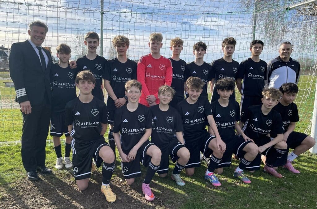 Die C‑Jugend der SG Ammersee startet nicht nur sportlich durch – auch optisch hebt das Team jetzt ab. Denn Moritz Reuter, Gründer und Gesellschafter der Firma ALPEN AIR www.alpenair.de, hat den ambitionierten Nachwuchsfußballern freundlicherweise einen kompletten Satz neuer Trikots gesponsert. Passender könnte der Sponsor kaum sein, denn ALPEN AIR ist spezialisiert auf spektakuläre Rundflüge über die bayerischen Seen und Alpen. Und einen wahren Höhenflug wünschen sich Spieler, Trainer und Fans nun auch für die Rückrunde der jungen Kicker. Das Team der SG Ammersee bedankt sich herzlich bei ALPEN AIR für die Unterstützung.